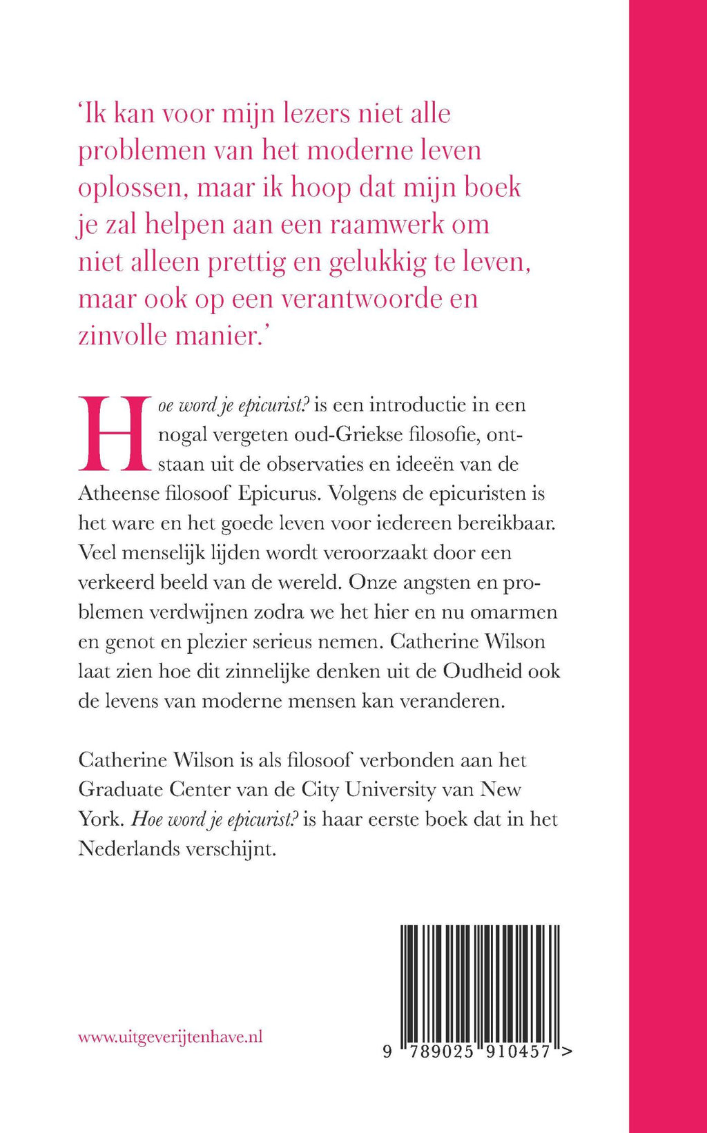 Hoe word je epicurist? is een introductie in een nogal vergeten oud-Griekse filosofie, ontstaan uit de observaties en ideeën van de Atheense filosoof Epicurus. Volgens de epicuristen is het ware en het goede leven voor iedereen bereikbaar. Veel menselijk lijden wordt veroorzaakt door een verkeerd beeld van de wereld. Onze angsten en problemen verdwijnen zodra we het hier en nu omarmen en genot en plezier serieus nemen. Catherine Wilson laat zien hoe dit zinnelijke denken uit de Oudheid ook de levens van moderne mensen kan veranderen.