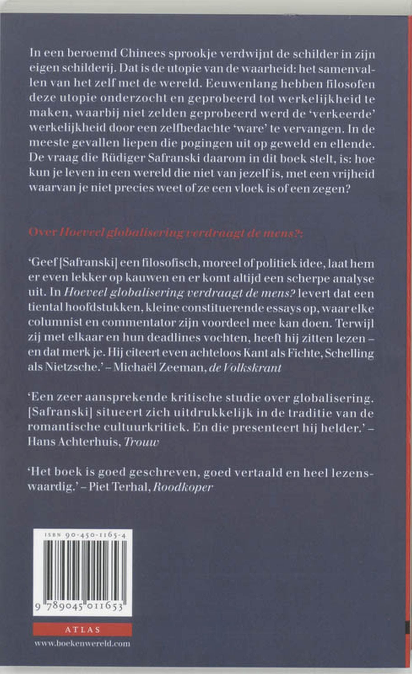 In een beroemd Chinees sprookje verdwijnt de schilder in zijn eigen schilderij. Dat is de utopie van de waarheid: het samenvallen van het zelf met de wereld. Eeuwenlang hebben filosofen deze utopie onderzocht en geprobeerd tot werkelijkheid te maken, waarbij niet zelden geprobeerd werd de 'verkeerde' werkelijkheid door een zelfbedachte 'ware' te vervangen. In de meeste gevallen liepen die pogingen uit op geweld en ellende. De vraag die Rüdiger Safranski daarom in dit boek stelt, is: hoe kun je leven in een wereld die niet van jezelf is, met een vrijheid waarvan je niet precies weet of ze een vloek is of een zegen?