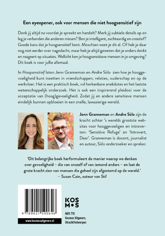 Jenn Granneman en André Solo laten zien hoe hooggevoeligheid ingezet kan worden in vriendschappen, relaties, ouderschap en op de werkvloer. Hoogsensitief verweeft praktisch advies, herkenbare anekdotes en het laatste wetenschappelijke onderzoek. Zo kunnen we een wereld creëren waar deze diep menselijke kwaliteit genormaliseerd wordt, en gevoelige mensen eindelijk kunnen bloeien. En als ze dat doen, zal de samenleving profiteren van hun unieke gaven. Dit inspirerende boek heeft de kracht om voorgoed te veranderen hoe we gevoelige mensen zien, en hoe zij zichzelf zien.