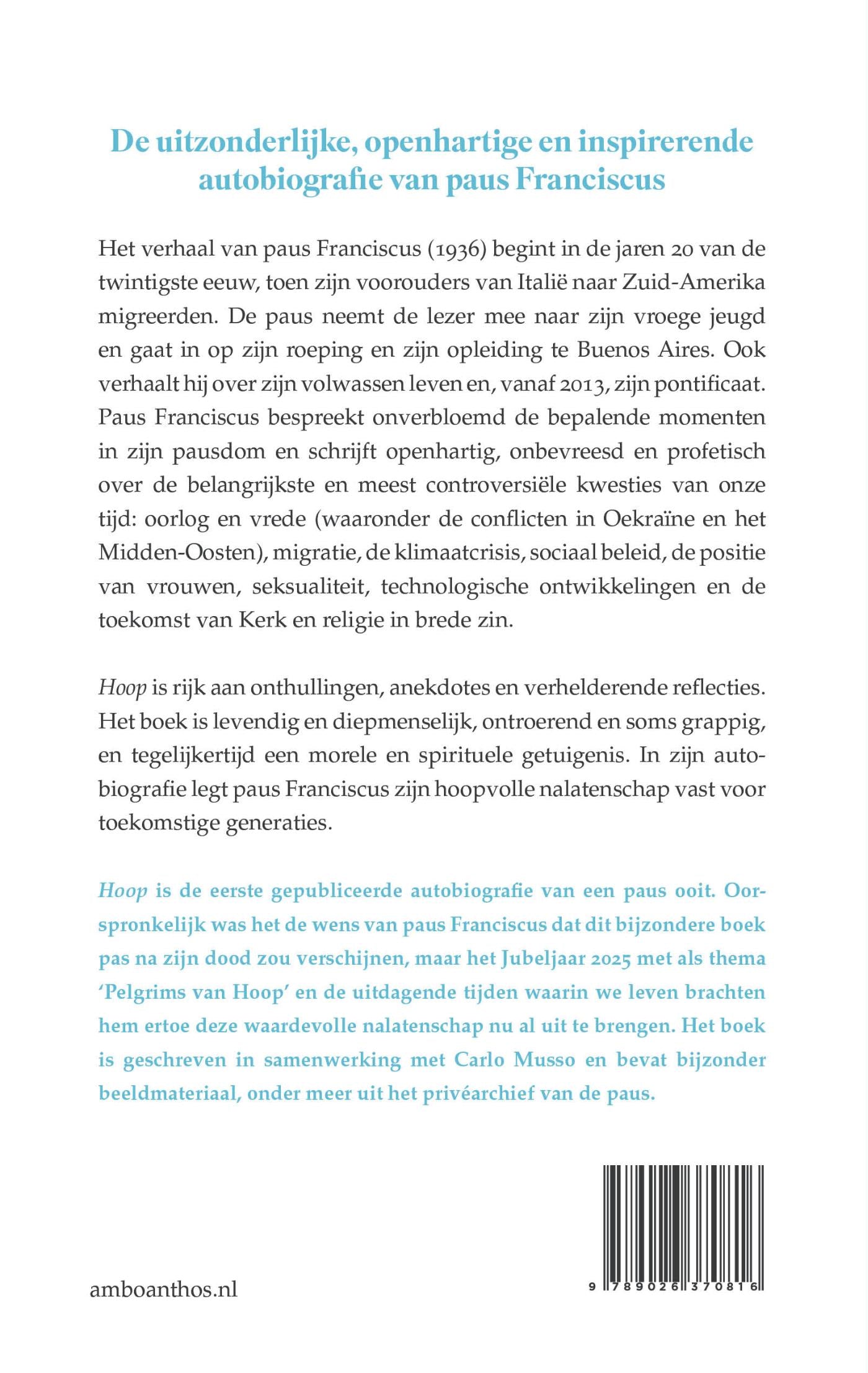 Hoop is de eerste gepubliceerde autobiografie van een paus ooit. Oorspronkelijk was het de wens van paus Franciscus dat dit bijzondere boek pas na zijn dood zou verschijnen, maar het Jubeljaar 2025 met als thema ‘Pelgrims van Hoop’ en de uitdagende tijden waarin we leven brachten hem ertoe deze waardevolle nalatenschap nu al uit te brengen. Het boek is geschreven in samenwerking met Carlo Musso en bevat bijzonder beeldmateriaal, onder meer uit het privéarchief van de paus.