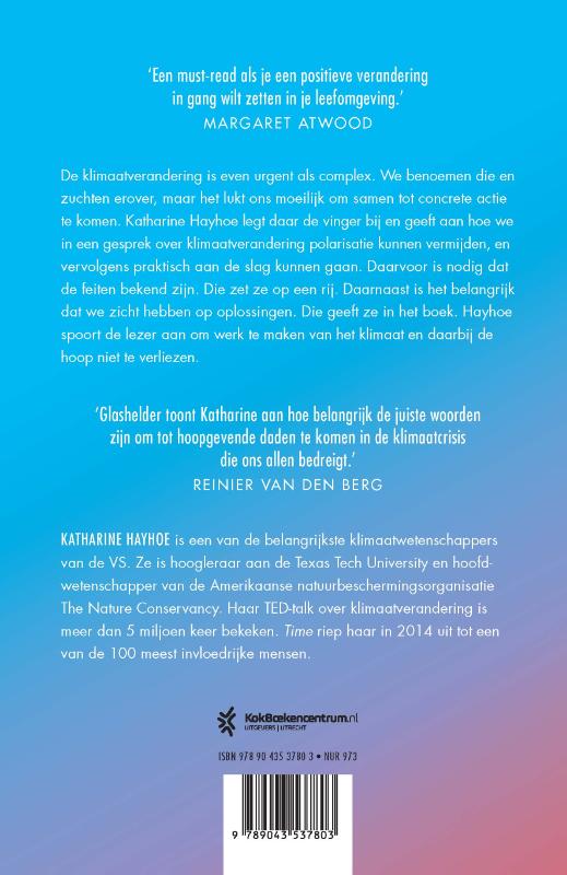 Niemand kan het probleem van de klimaatverandering zo goed onder woorden brengen als Katharine Hayhoe in haar boek Hoop voor de aarde: hoe we samen het klimaat kunnen redden. De klimaatverandering is even urgent als complex. We benoemen het en zuchten erover, maar het lukt ons moeilijk om samen tot concrete actie te komen. Katharine Hayhoe legt daar de vinger bij en geeft aan hoe we vanuit een gesprek hierover heel praktisch aan de slag kunnen gaan om het klimaat te redden. Daarvoor is nodig dat de feiten bekend zijn. Die zet ze op een rij. Daarnaast is het belangrijk dat we zicht hebben op oplossingen. Die geeft ze in het boek. Hayhoe spoort de lezer aan om werk te maken van het klimaat en daarbij de hoop niet te verliezen. ‘Glashelder toont Katharine aan hoe belangrijk de juiste woorden zijn om tot hoopgevende daden te komen in de klimaatcrisis die ons allen bedreigt’ (Reinier van den Berg).