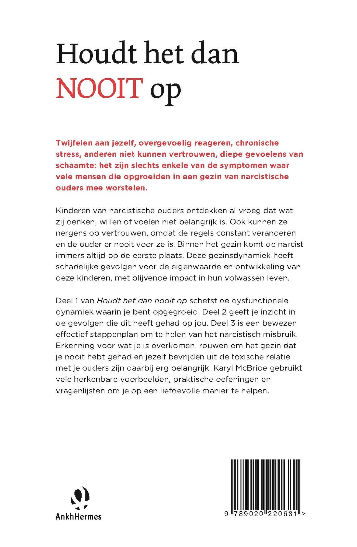 Deel 1 van Houdt het dan nooit op schetst de dysfunctionele dynamiek waarin je bent opgegroeid. Deel 2 geeft je inzicht in de gevolgen die dit heeft gehad op jou. Deel 3 is een bewezen effectief stappenplan om te helen van het narcistisch misbruik.