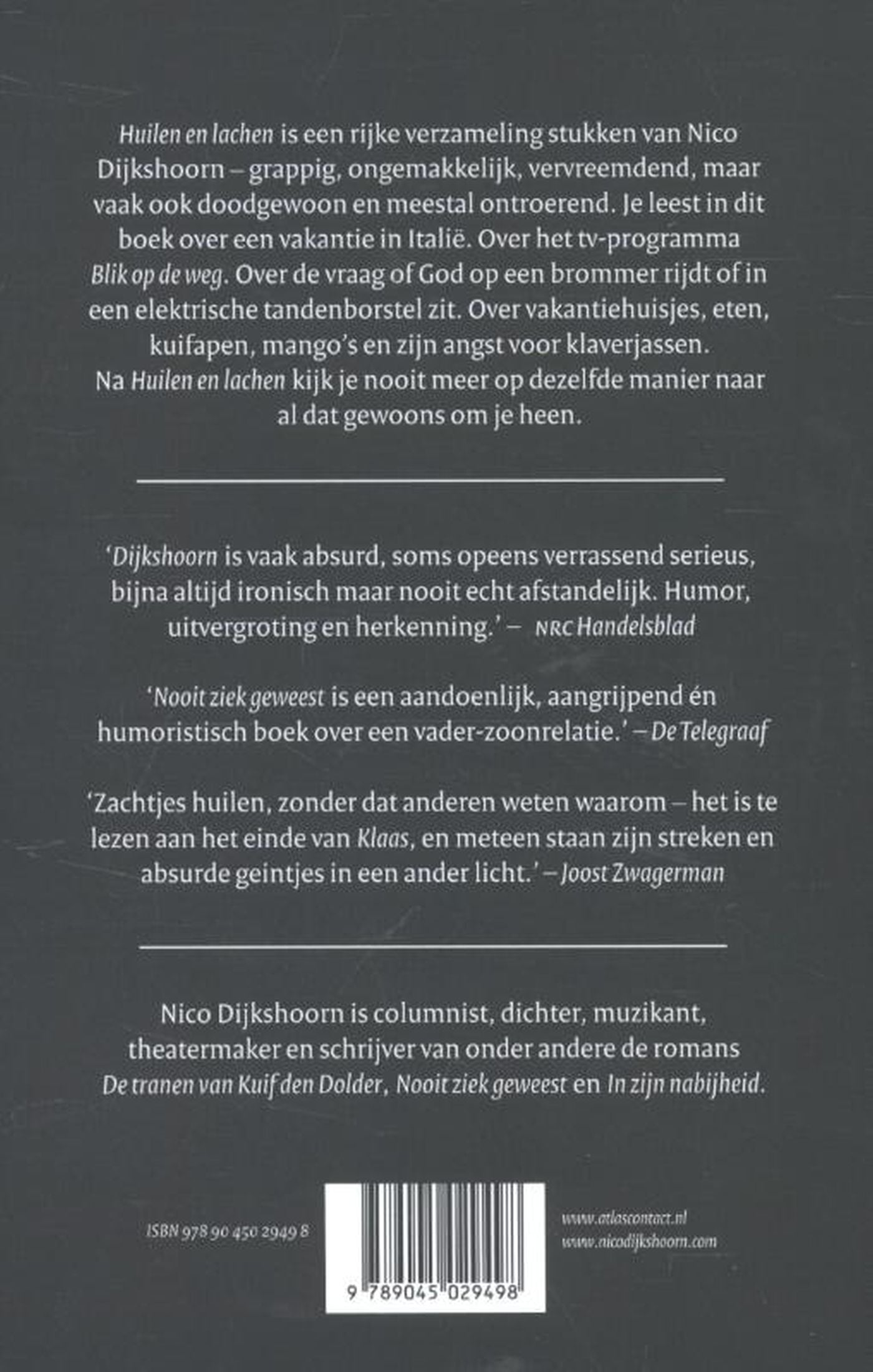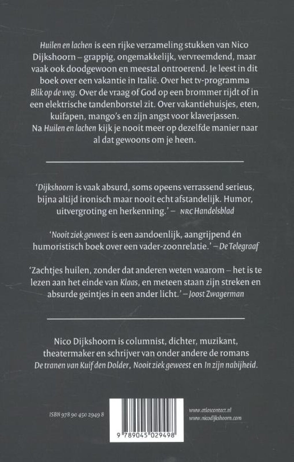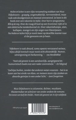 Huilen en lachen is een rijke verzameling stukken van Nico Dijkshoorn – grappig, ongemakkelijk, vervreemdend, maar vaak ook doodgewoon en meestal ontroerend. Je leest in dit boek over een vakantie in Italië, over het tv-programma Blik op de weg. Over de vraag of God op een brommer rijdt of in een elektrische tandenborstel zit. Over vakantiehuisjes, eten, kuifapen, mango’s en over zijn angst voor klaverjassen. Het is goed om via Huilen en lachen de wereld van Nico Dijkshoorn in te duiken. Nooit kijk je meer op dezelfde manier naar al dat gewoons om je heen.