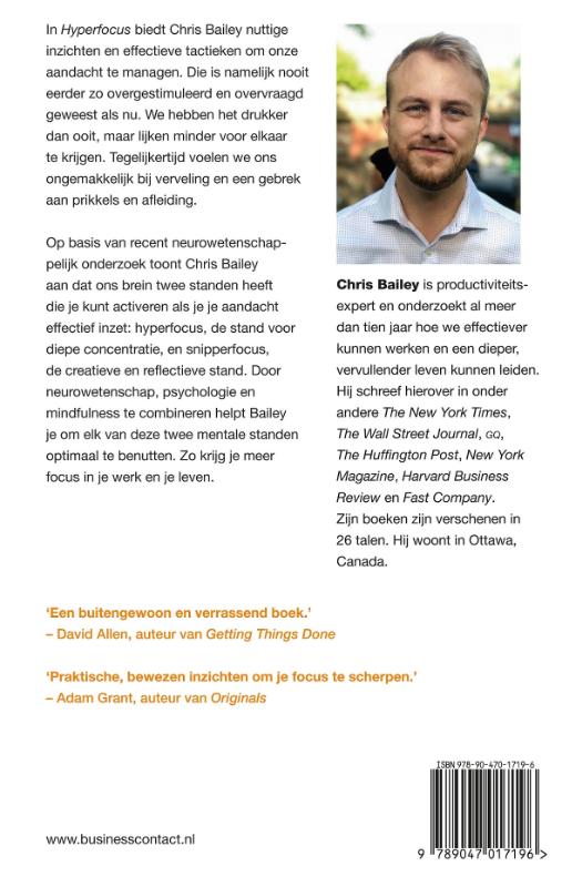 Chris Bailey laat in ‘Hyperfocus’ zien dat ons brein twee standen heeft, die je kunt activeren als je je aandacht effectief inzet: hyperfocus, de stand voor diepe concentratie, en snipperfocus, de creatieve en reflectieve stand. Door neurowetenschap, psychologie en mindfulness te combineren helpt Bailey je om elk van deze twee mentale standen optimaal te benutten. Zo krijg je meer focus in werk en leven.