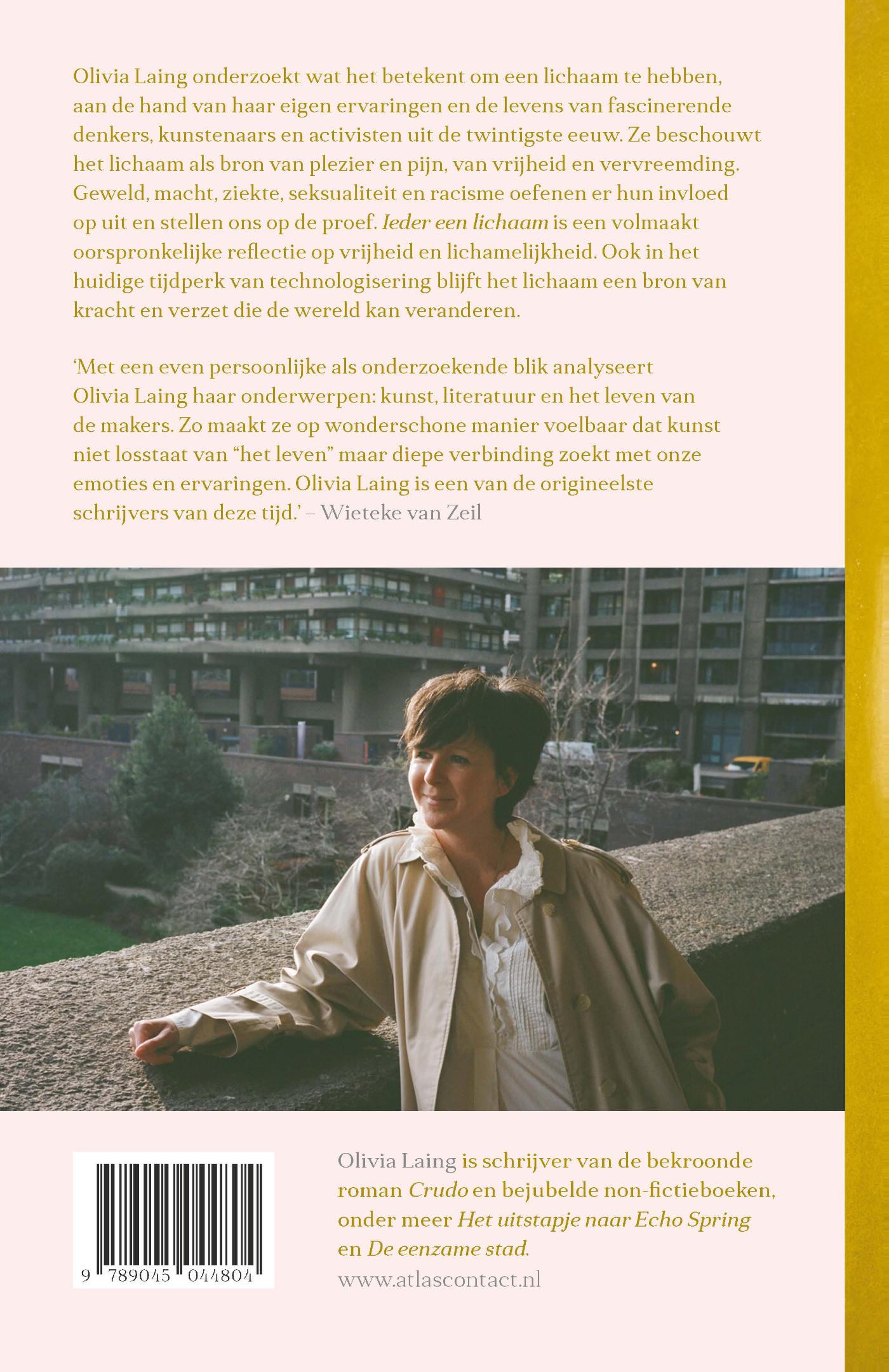 In ‘Ieder een lichaam’ onderzoekt Olivia Laing wat het betekent om een lichaam te hebben, aan de hand van haar eigen ervaringen en de levens van de meest fascinerende denkers uit de twintigste eeuw. Ieder een lichaam is een volmaakt oorspronkelijke reflectie op vrijheid en lichamelijkheid van een schrijver met een onafhankelijke geest, oog voor complexiteit en een glasheldere pen. Want ook in het tijdperk van technologisering en automatisering blijft het lichaam een bron van kracht en verzet die de wereld kan veranderen.