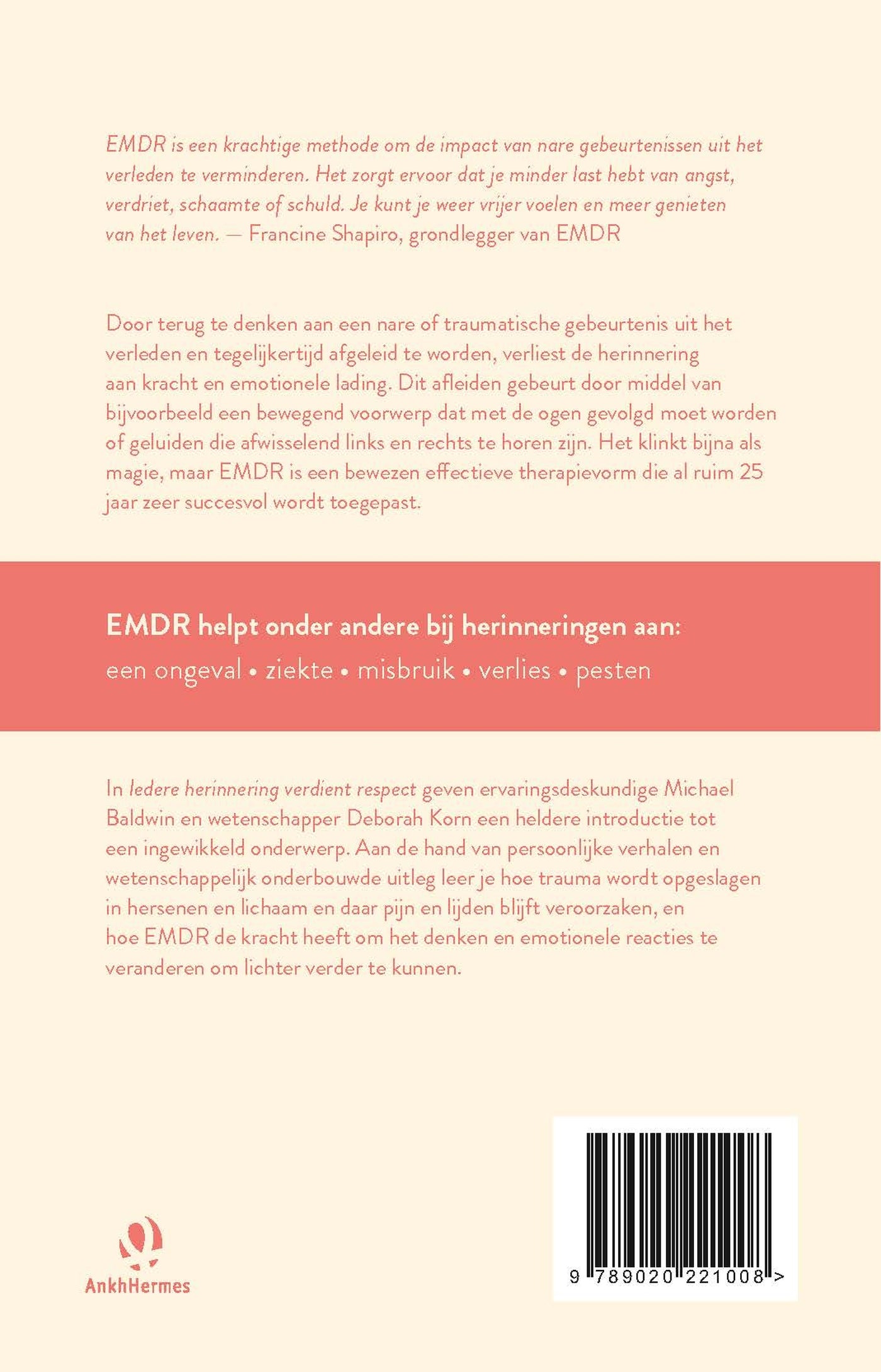 In Iedere herinnering verdient respect geven ervaringsdeskundige Michael Baldwin en wetenschapper Deborah Korn een heldere introductie tot een ingewikkeld onderwerp. Aan de hand van persoonlijke verhalen en wetenschappelijk onderbouwde uitleg leer je hoe trauma wordt opgeslagen in hersenen en lichaam en daar pijn en lijden blijft veroorzaken, en hoe EMDR de kracht heeft om het denken en emotionele reacties te veranderen om lichter verder te kunnen.