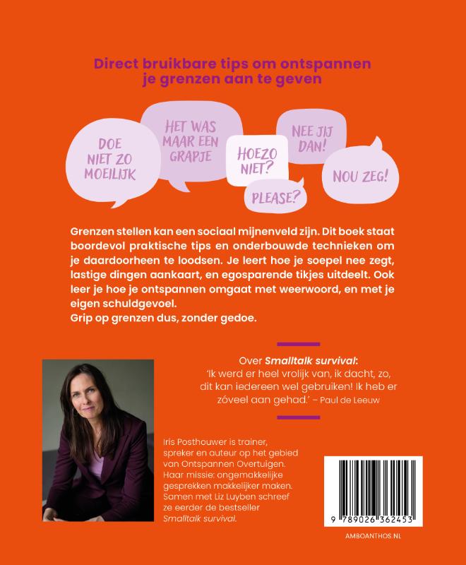 Grenzen stellen kan een sociaal mijnenveld zijn. Dit boek staat boordevol praktische tips en onderbouwde technieken om je daardoorheen te loodsen. Je leert hoe je soepel nee zegt, lastige dingen aankaart, en egosparende tikjes uitdeelt. Ook leer je hoe je ontspannen omgaat met weerwoord, en met je eigen schuldgevoel.