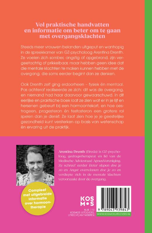 Het ligt niet aan jou, het is de overgang van Arentina Drenth laat zien hoe de overgang niet alleen fysieke, maar ook mentale uitdagingen met zich meebrengt. Veel vrouwen kampen met somberheid, angst, boosheid of burn-outklachten zonder te weten dat hormonen hierbij een grote rol spelen. Arentina Drenth, GZ-psycholoog, helpt vrouwen inzicht te krijgen in de invloed van oestrogeen, progesteron én testosteron op hun geestelijke gezondheid.