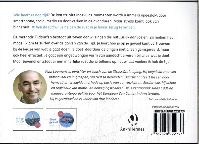 Stress komt niet alleen van buitenaf, maar vooral van binnenuit. Paul Loomans introduceert in 'Ik heb de tijd' zijn methode Tijdsurfen. De methode bestaat uit zeven 'natuurlijke aanwijzingen' die bij elkaar horen en elkaar als het ware oproepen. Deze aanwijzingen kun je gemakkelijk toepassen in je leven. Zij maken het mogelijk om te surfen op de golven van de Tijd. Je leert hoe je op je gevoel kunt vertrouwen bij de keuze van wat je gaat doen.