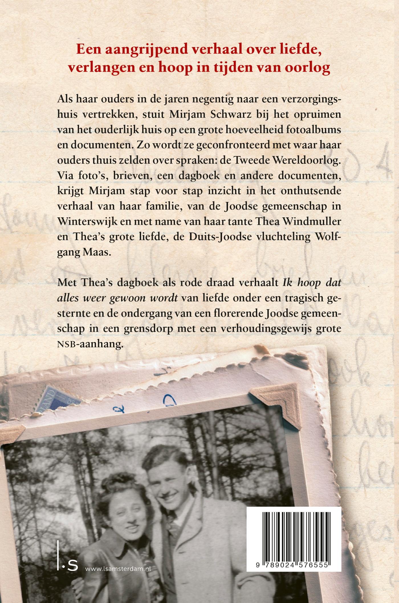 Met Thea’s dagboek als rode draad verhaalt Ik hoop dat alles weer gewoon wordt van liefde onder een tragisch gesternte, en de ondergang van een florerende Joodse gemeenschap in een grensdorp met een grote nsb-aanhang.