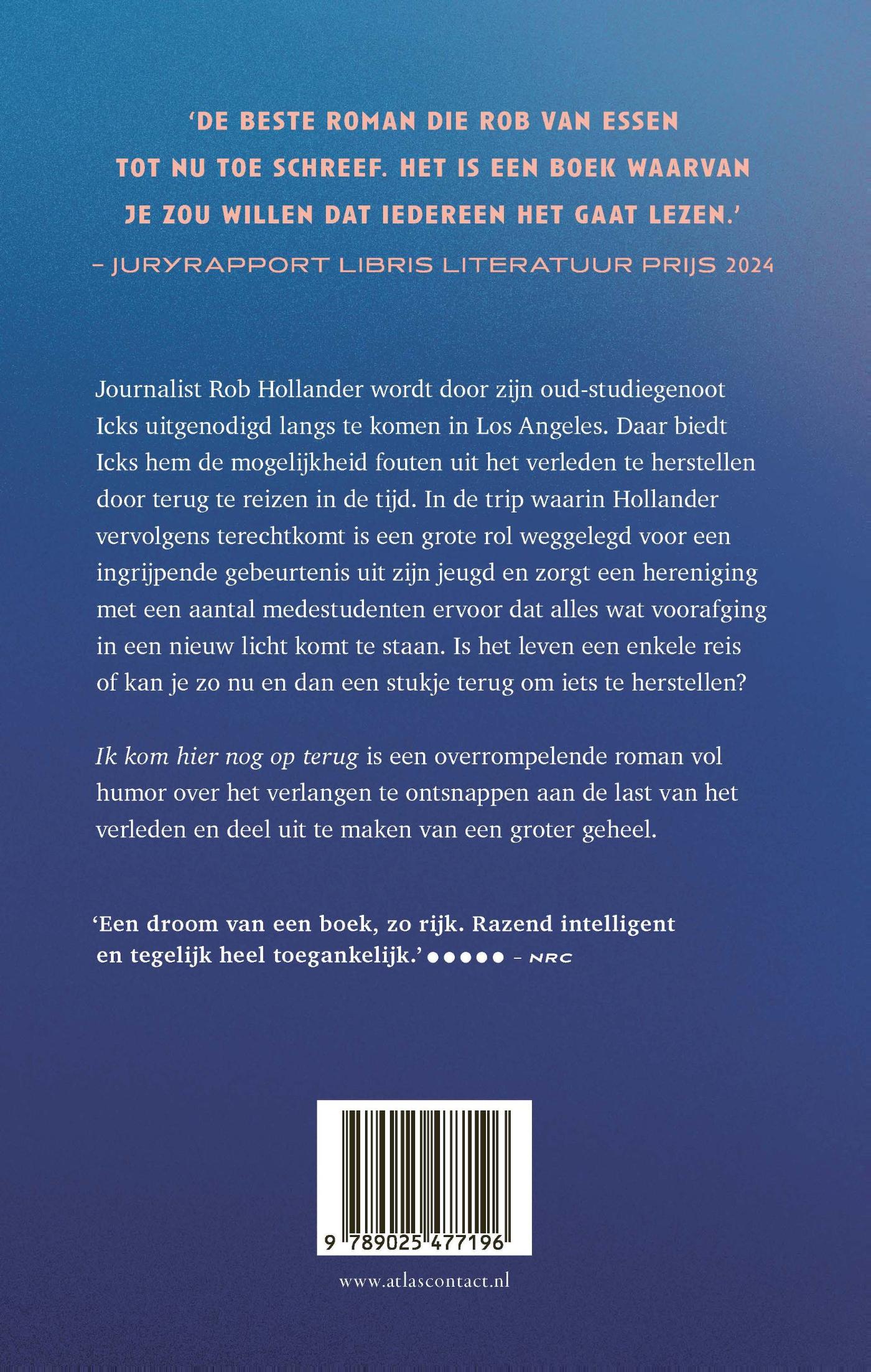 Journalist Rob Hollander wordt door een oud-studiegenoot uitgenodigd langs te komen in Los Angeles. Daar biedt deze Icks hem de mogelijkheid fouten uit het verleden te herstellen, door terug te reizen in de tijd. In de trip waarin Hollander vervolgens terechtkomt is een grote rol weggelegd voor een ingrijpende gebeurtenis uit zijn jeugd, en zorgt een hereniging met een aantal medestudenten ervoor dat alles in een nieuw licht wordt geplaatst. Is het leven een enkele reis, of kun je zo nu en dan een stukje terug om iets te herstellen?Ik kom hier nog op terug is een meeslepende en verrassende roman. Net als in zijn eerdere, diverse malen bekroonde boeken slaagt Van Essen erin de alledaagse werkelijkheid te vermengen met het onverwachte en het onmogelijke, in een roman over schijn en werkelijkheid, de onvermijdelijke last van het verleden, en de noodzaak deel uit te maken van een groter geheel.