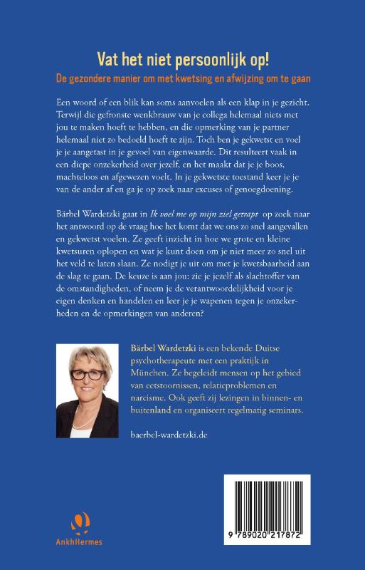 Bärbel Wardetzki onderzoekt in haar boek Ik voel me op mijn ziel getrapt waarom we ons toch zo snel onzeker, boos en afgewezen voelen. Ze geeft inzicht in hoe we die kleine en grote kwetsuren oplopen en handvatten om met die kwetsbaarheid aan de slag te gaan. Van slachtoffer van de omstandigheden naar weerbaar kunnen omgaan met de opmerkingen van anderen: een boek met grote helende waarde.