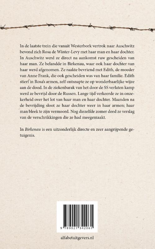 In de laatste trein die vanuit Westerbork vertrok naar Auschwitz bevond zich Rosa de Winter-Levy met haar man en haar dochter. In Auschwitz werd ze direct na aankomst ruw gescheiden van haar man. Ze belandde in Birkenau, waar ook haar dochter van haar werd afgenomen. Ze raakte bevriend met Edith, de moeder van Anne Frank, die ook gescheiden was van haar familie. Edith stierf in Rosa’s armen, zelf ontsnapte ze op wonderbaarlijke wijze aan de dood. In de ziekenbarak van het door de SS verlaten kamp werd ze bevrijd door de Russen. Lange tijd verkeerde ze in onzekerheid over het lot van haar man en haar dochter. Maanden na de bevrijding sloot ze haar dochter weer in haar armen; haar man bleek te zijn vermoord. Nog diezelfde zomer deed ze verslag van de verschrikkingen die ze had meegemaakt. ‘In Birkenau’ is een uitzonderlijk directe en zeer aangrijpende getuigenis.