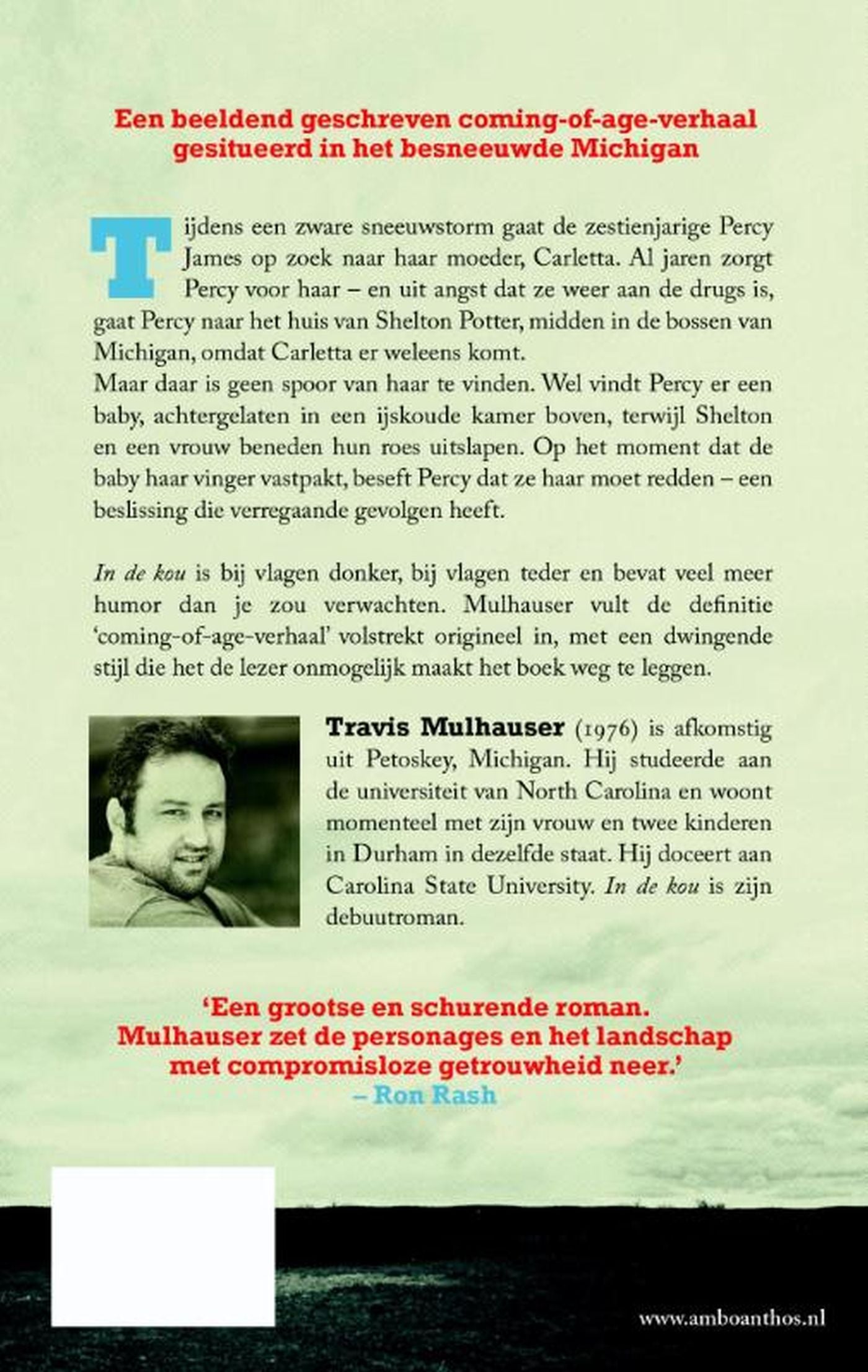 ‘In de kou’ is een rauw coming-of-ageverhaal geschreven door Travis Mulhauser, waarin de zestienjarige Percy James op zoek gaat naar haar moeder. Midden in een sneeuwstorm rijdt ze naar het huis van Shelton Potter in de heuvels in het noorden van de staat Michigan.