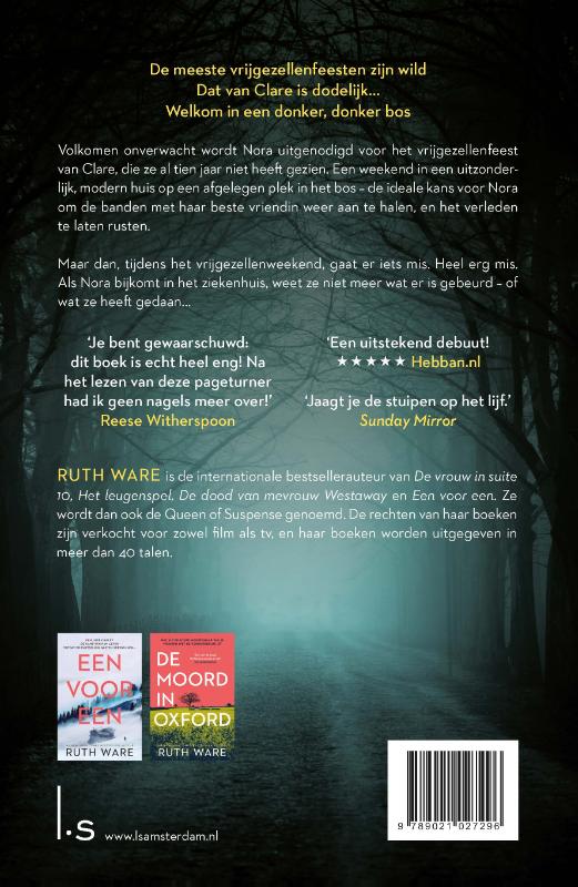 In een donker, donker bos, de bestseller van Ruth Ware, is een psychologische thriller met een geraffineerde plot, onverwachte wendingen en een loepzuivere kijk op vergiftigde vrouwenvriendschappen. Reese Witherspoon is bezig met de verfilming.