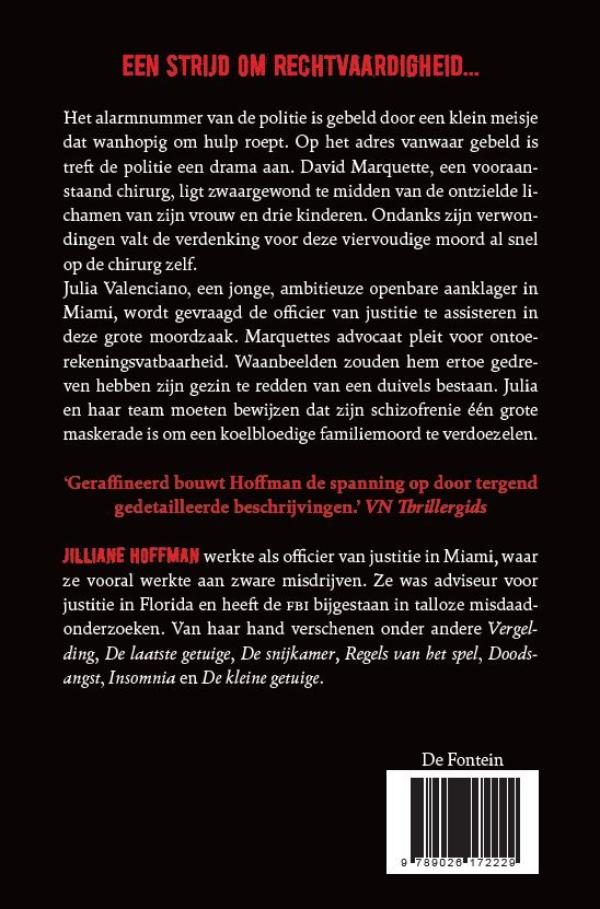 'In een vlaag van waanzin' van Jilliane Hoffman. Het alarmnummer van de politie is gebeld door een klein meisje dat wanhopig om hulp roept. Op het adres van waar gebeld is treft de politie een drama aan. David Marquette, een vooraanstaand chirurg, ligt zwaargewond te midden van de ontzielde lichamen van zijn vrouw en drie kinderen. Ondanks zijn verwondingen valt de verdenking voor deze viervoudige moord al snel op de chirurg zelf.