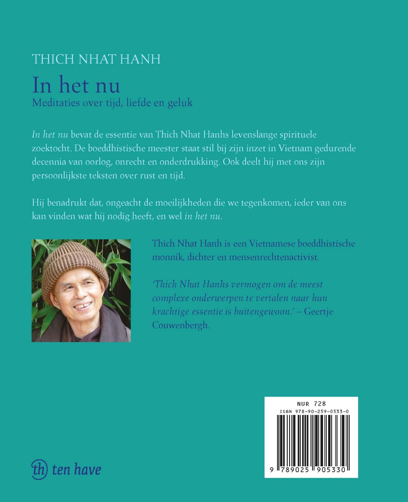 Thich Nhat Hanh deelt in ‘In het nu’ de essentie van zijn levenslange spirituele zoektocht met de lezer, in zijn tot nog toe meest persoonlijke teksten over kalmte en tijd. De boeddhistische meester staat stil bij zijn inzet in Vietnam gedurende decennia van oorlog, onrecht en onderdrukking. Hij benadrukt dat, ongeacht de moeilijkheden die we tegenkomen, eenieder van ons kan vinden wat hij nodig heeft als hij of zij in het nu leeft.