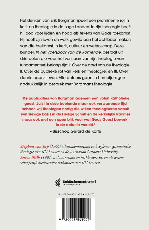Het denken van Erik Borgman speelt een prominente rol in kerk en theologie in de Lage Landen. In zijn theologie heeft hij oog voor lijden en hoop als tekens van Gods toekomst. Hij heeft zijn leven en werk gewijd aan het zichtbaar maken van die toekomst, in kerk, cultuur en wetenschap. Deze bundel, In het voetspoor van de Komende, bestaat uit drie delen die voor het verstaan van zijn theologie van fundamenteel belang zijn: I. Over de aard van de theologie; II. Over de publieke rol van kerk en theologie; en III. Over dominicaans leven. Alle auteurs gaan in hun bijdragen nadrukkelijk in gesprek met Borgmans theologie.