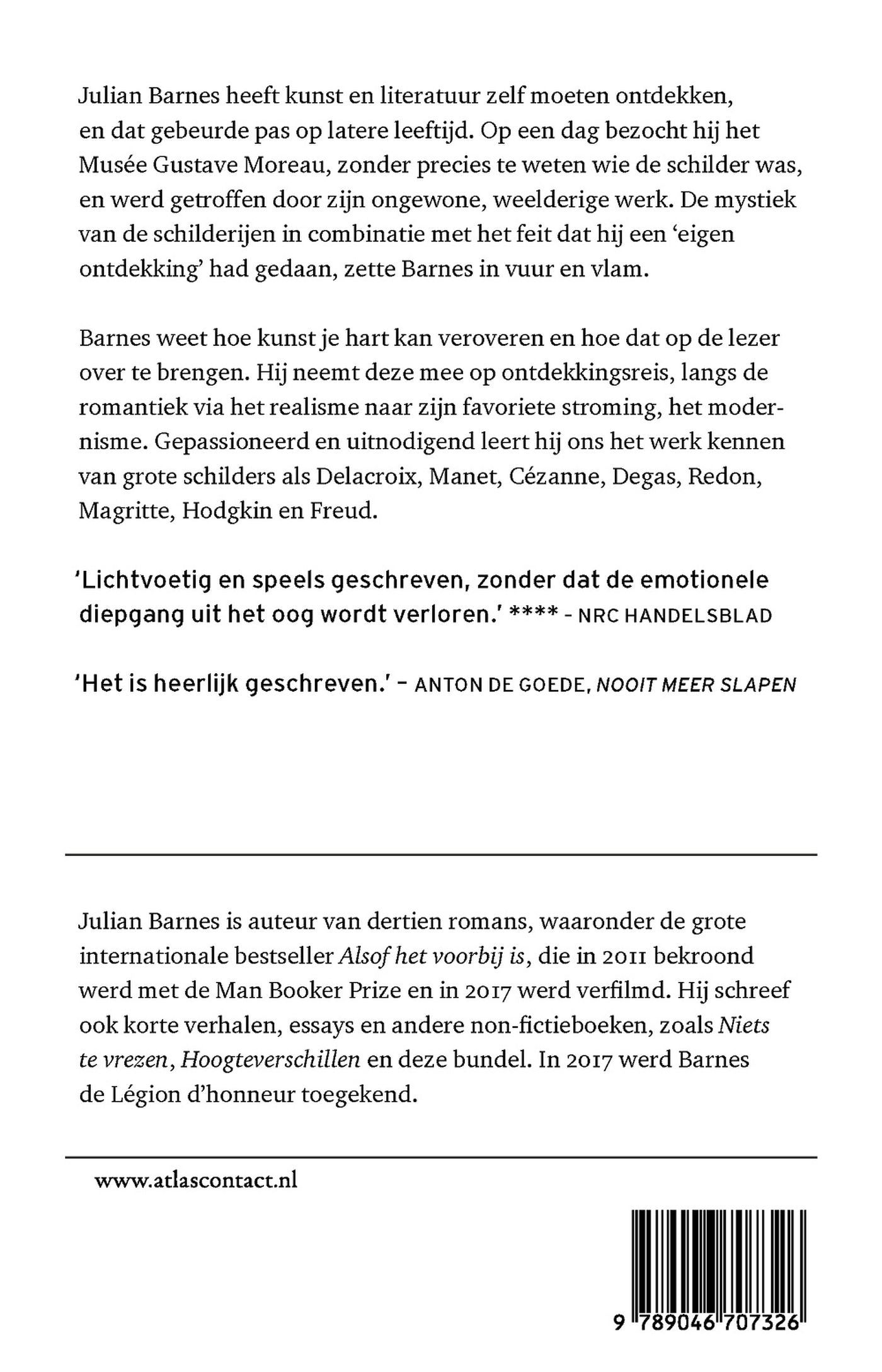 Julian Barnes weet hoe kunst je hart kan veroveren en hoe dat op de lezer over te brengen. Hij neemt de lezer mee op ontdekkingsreis langs de romantiek, het realisme naar zijn favoriete stroming, het modernisme. Gepassioneerd en uitnodigend leert hij ons het werk kennen van grote schilders als Delacroix, Courbet, Manet, Cézanne, Degas, Redon, Bonnard, Magritte, Howard Hodgkin en Lucian Freud.