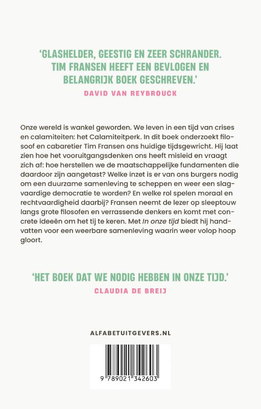 Onze wereld is wankel geworden. We leven in een tijd van crises en calamiteiten: het Calamiteitperk. In dit boek onderzoekt filosoof en cabaretier Tim Fransen ons huidige tijdsgewricht. Hij laat zien hoe het vooruitgangsdenken ons heeft misleid en vraagt zich af: hoe herstellen we de maatschappelijke fundamenten die daardoor zijn aangetast? Welke inzet is er van ons burgers nodig om een duurzame samenleving te scheppen en weer een slagvaardige democratie te worden? En welke rol spelen moraal en rechtvaardigheid daarbij? Fransen neemt de lezer op sleeptouw langs grote filosofen en verrassende denkers en komt met concrete ideeën om het tij te keren. Met 'In onze tijd' biedt hij handvatten voor een weerbare samenleving waarin weer volop hoop gloort.