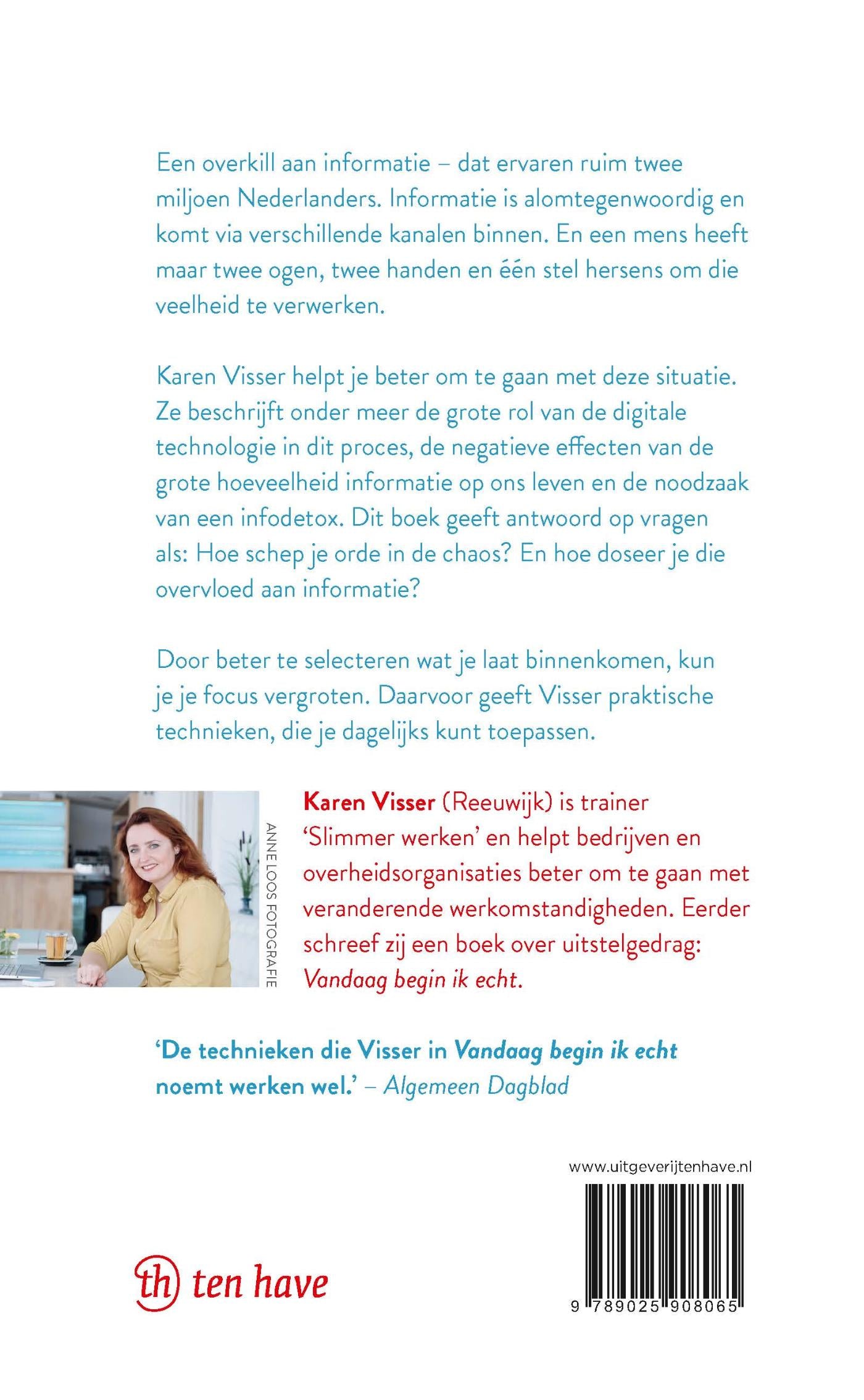 Karen Visser biedt met ‘Infodetox’ praktische technieken die je helpen om je focus te vergroten door selectiever te worden in wat je laat binnenkomen.