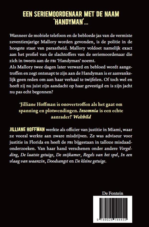Jilliane Hoffman staat garant voor harde, ijzingwekkende thrillers. 'Insomnia' : Na de vondst van het mobieltje en de bebloede jas van de vermiste 17-jarige Mallory, is de politie in de hoogste staat van paraatheid. Is zij het volgende slachtoffer van wat de FBI ‘Handyman’ noemt?