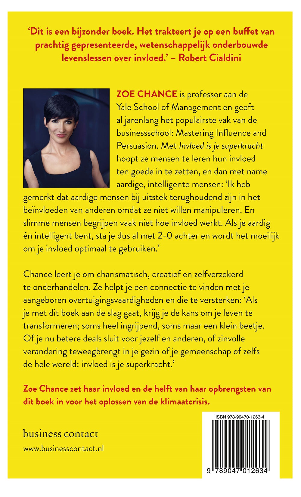 Met ‘Invloed is je superkracht’ hoopt Zoe Chance meer mensen te leren hun invloed ten goede in te zetten; met name aardige, intelligente mensen. Ze is professor aan de Yale School of Management en geeft al jarenlang het populairste vak van de businessschool: Mastering Influence and Persuasion. ‘Ik heb gemerkt dat aardige mensen bij uitstek terughoudend zijn in het beïnvloeden van anderen omdat ze niet willen manipuleren. En slimme mensen begrijpen vaak niet hoe invloed werkt. Als je aardig en intelligent bent, sta je dus al met 2-0 achter en wordt het moeilijk om je invloed optimaal te gebruiken.’ Chance zet haar invloed en de helft van haar opbrengsten van dit boek in voor het oplossen van de klimaatcrisis.