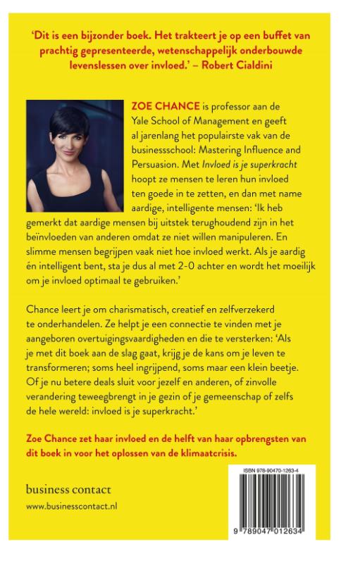 Met ‘Invloed is je superkracht’ hoopt Zoe Chance meer mensen te leren hun invloed ten goede in te zetten; met name aardige, intelligente mensen. Ze is professor aan de Yale School of Management en geeft al jarenlang het populairste vak van de businessschool: Mastering Influence and Persuasion. ‘Ik heb gemerkt dat aardige mensen bij uitstek terughoudend zijn in het beïnvloeden van anderen omdat ze niet willen manipuleren. En slimme mensen begrijpen vaak niet hoe invloed werkt. Als je aardig en intelligent bent, sta je dus al met 2-0 achter en wordt het moeilijk om je invloed optimaal te gebruiken.’ Chance zet haar invloed en de helft van haar opbrengsten van dit boek in voor het oplossen van de klimaatcrisis.