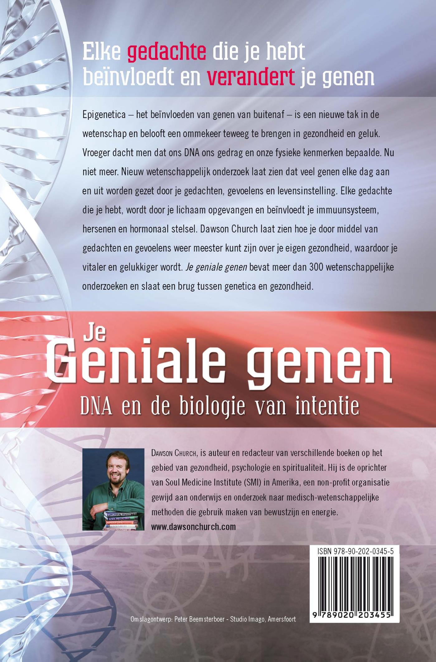 Elke gedachte die je hebt beïnvloedt en verandert je genen Epigenetica het beïnvloeden van genen van buitenaf is een nieuwe tak in de wetenschap en belooft een ommekeer teweeg te brengen in gezondheid en geluk. Vroeger dacht men dat ons DNA ons gedrag en onze fysieke kenmerken bepaalde. Nu niet meer. Nieuw wetenschappelijk onderzoek laat zien dat veel genen elke dag aan en uit worden gezet door je gedachten, gevoelens en levensinstelling. Elke gedachte die je hebt, wordt door je lichaam opgevangen en beïnvloedt je immuunsysteem, hersenen en hormonaal stelsel. Dawson Church laat zien hoe je door middel van gedachten en gevoelens weer meester kunt worden over je eigen gezondheid, waardoor je vitaler en gelukkiger wordt. Je geniale genen bevat meer dan 300 wetenschappelijke onderzoeken en slaat een brug tussen genetica en gezondheid