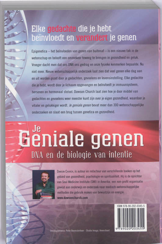 Epigenetica – het beïnvloeden van genen van buitenaf – is een nieuwe tak in de wetenschap en belooft een ommekeer teweeg te brengen in gezondheid en geluk. Vroeger dacht men dat ons DNA ons gedrag en onze fysieke kenmerken bepaalde. Nu niet meer. Nieuw wetenschappelijk onderzoek laat zien dat veel genen elke dag aan en uit worden gezet door je gedachten, gevoelens en levensinstelling. Elke gedachte die je hebt, wordt door je lichaam opgevangen en beïnvloedt je immuunsysteem, hersenen en hormonaal stelsel. Dawson Church laat zien hoe je door middel van gedachten en gevoelens weer meester kunt worden over je eigen gezondheid, waardoor je vitaler en gelukkiger wordt. Je geniale genen bevat meer dan 300 wetenschappelijke onderzoeken en slaat een brug tussen genetica en gezondheid. Elke gedachte die je hebt beïnvloedt en verandert je genen