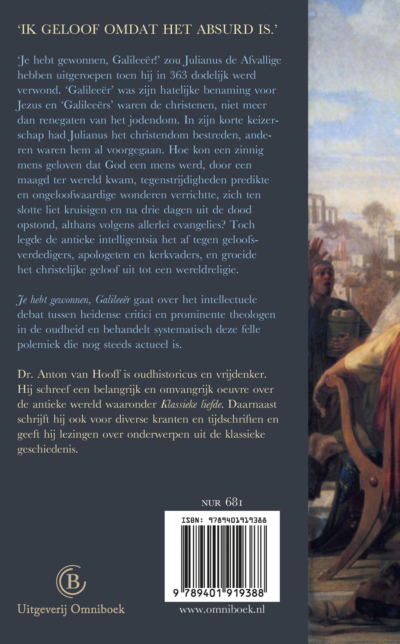 Prominente theologen en heidense intellectuelen sloegen elkaar vanaf de tweede eeuw met argumenten in fraaie bewoordingen om de oren. In ‘Je hebt gewonnen, Galileeër’ haalt oudhistoricus Anton van Hooff dit antieke debat uit de vergetelheid. Het debat ging eeuwenlang door, ook nadat Constantijn de Grote in 312 de christelijke godsdienst een voorkeurspositie gaf. De antieke intelligentsia legde het uiteindelijk af tegen de ‘Galileeërs’, een scheldnaam voor de oude christenen. ‘Credo quia absurdum’, oftewel ‘ik geloof omdat het absurd is’, zegevierde.