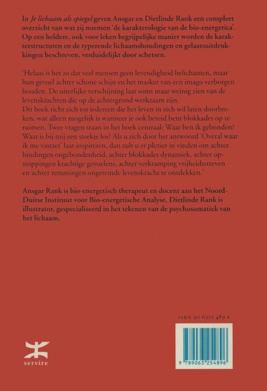 In Je lichaam als spiegel geven Ansgar en Dietlinde Rank een compleet overzicht van wat zij noemen 'de karakterologie van de bio-energetica'. Op een heldere, ook voor leken begrijpelijke manier worden de karakterstructuren en de typerende lichaamshoudingen en gelaatsuitdrukkingen beschreven, verduidelijkt door schetsen.