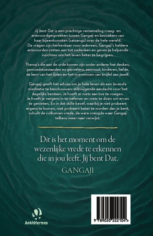 'Jij bent Dat' van Gangaji is een bloemlezing van klassieke uitspraken en helpt antwoorden te vinden op de vragen over ons bestaan. Gangaji, spiritueel leraar van Amerikaanse origine, heeft met haar workshops en lezingen het leven van velen blijvend veranderd. 'Jij bent Dat' geeft inzichten en helpt ons antwoorden te vinden op de vragen die in het leven op ons afkomen. Thema's zijn onder andere: het denken, de kern van het lijden, het overwinnen van twijfel aan jezelf. Gangaji weet zoekers uit alle windstreken, helder en direct tot de kern te brengen. Haar uitleg helpt ons om zelftwijfel te overwinnen en een dieper begrip van ons eigen grenzeloze bewustzijn te ontwikkelen. Vaak zijn er onverwachte momenten van ontwaken. 'Dit is het uur van de waarheid,' zegt ze. 'Vat het niet te licht op. Besef dat je je hoe dan ook bewust bent van de mogelijkheid de waarheid van jezelf als grenzeloos bewustzijn te realiseren. Jij bent Dat.'