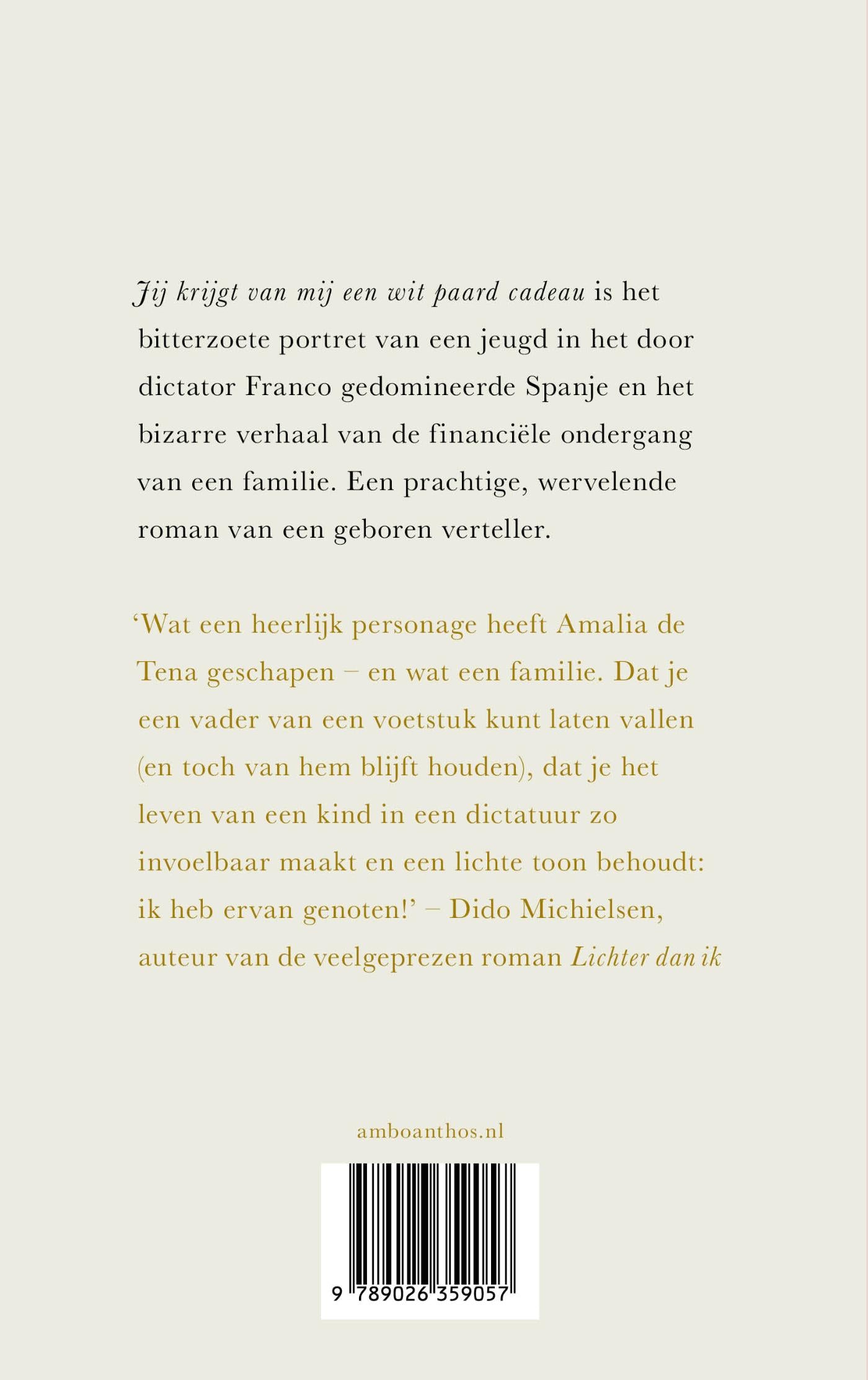 Jij krijgt van mij een wit paard cadeau van Amalia de Tena is het bitterzoete portret van een jeugd in het door dictator Franco gedomineerde Spanje en het bizarre verhaal van de financiële ondergang van een familie. Gebaseerd op de familiegeschiedenis van de auteur. Voor de lezers van Judith Fanto en Isabel Allende.