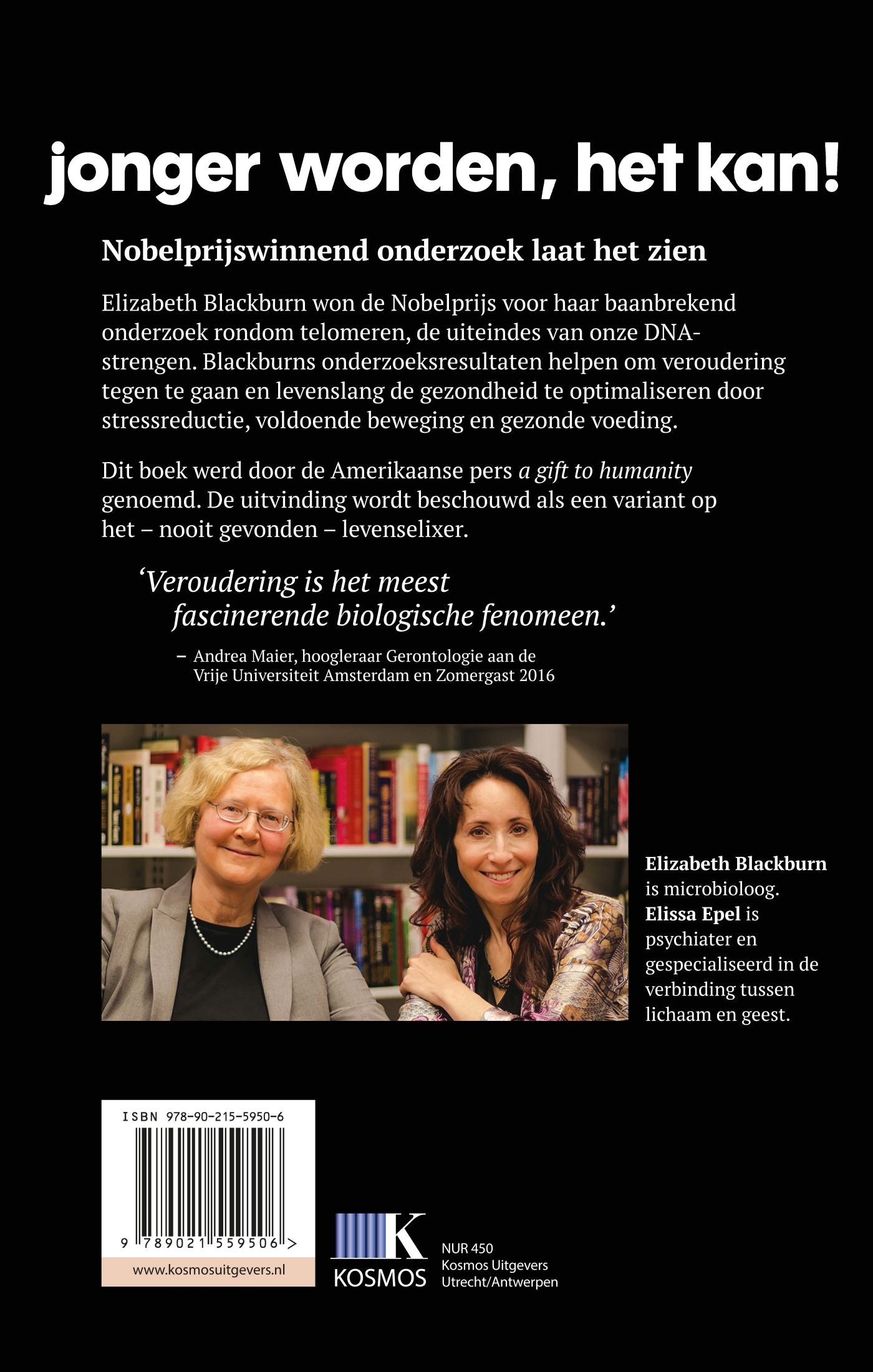 Elizabeth Blackburn won met haar baanbrekende onderzoek naar DNA en telomeren de Nobelprijs, en schreef samen met psychiater Elissa Epel het boek Jonger worden. Ga veroudering met behulp van de onderzoeksresultaten van Blackburn tegen en optimaliseer je gezondheid. Stressreductie, voldoende beweging en gezonde voeding dragen daar allemaal aan bij. Door deze nieuwe inzichten met betrekking tot de telomeren (DNA-uiteindes) is dit het eerste boek over dit onderwerp.