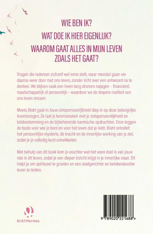 Meetu Bisht gaat in Jouw zielspersoonlijkheid diep in op deze belangrijke levensvragen. Je maakt kennis met je zielspersoonlijkheid en lotsbestemming en de bijbehorende karmische opdrachten. Deze leggen de basis voor wie je bent en voor het leven dat je leidt. Bisht ontrafelt het persoonlijke mysterie, de kracht en de innerlijke werking van een ziel, zodat je je als ziel kunt ontwikkelen.