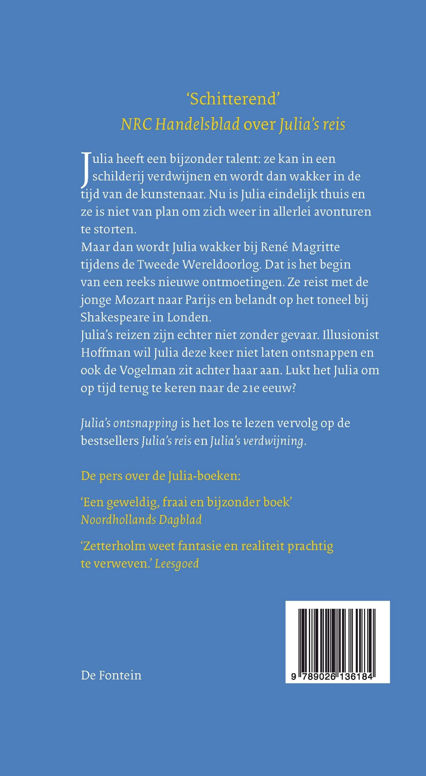 In Julia's ontsnapping trakteert Finn Zetterholm je opnieuw op een geweldig avontuur door de geschiedenis van de kunst. Julia's ontsnapping is het spannende vervolg op de succesvolle boeken Julia's reis en Julia's verdwijning. Julia bezit een bijzondere gave: ze kan verdwijnen in een schilderij en wordt dan wakker in de tijd van de kunstenaar. Ze komt ze terecht bij René Magritte in Brussel tijdens de Tweede Wereldoorlog, reist met de jonge Wolfgang Amadeus Mozart naar een concert in Parijs en belandt bij Shakespeare in Londen. Julia's reizen zijn niet zonder gevaar. Illusionist Hoffman duikt weer op, en die wil haar ook deze keer niet laten ontsnappen. Lukt het Julia om op tijd terug te keren naar de 21e eeuw? Julia's reis werd verkozen tot Jeugdboek van het jaar 2010. De pers over Julia's reis: `Schitterend NRC Handelsblad `Een geweldig, fraai en bijzonder boek Noordhollands Dagblad `Een adembenemend avontuur door zes eeuwen schilderkunst. Boekverkopers Finn Zetterholm (1945) is in Zweden vooral bekend als zanger en gitarist. Daarnaast schrijft hij liedjes en cabaretteksten voor radio en televisie. Finn heeft verschillende kinderboeken geschreven.