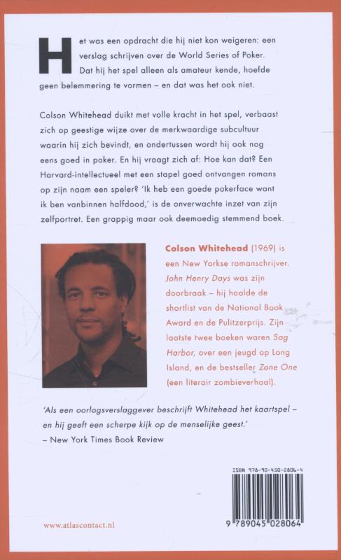 Colson Whitehead duikt met volle kracht in het spel, verbaast zich op geestige wijze over de merkwaardige subcultuur waarin hij zich bevindt, en ondertussen wordt hij ook nog eens goed in het spel. En hij vraagt zich af: Hoe kan dat? Een Harvard-intellectueel met een stapel goed ontvangen romans op zijn naam een pokeraar? 'Ik heb een goede pokerface want ik ben vanbinnen halfdood,' is de onverwachte inzet van zijn zelfportret. Een grappig maar ook deemoedig stemmend boek.