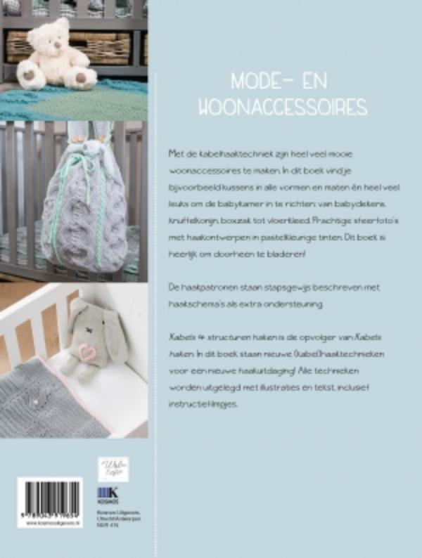 In het vervolg op Kabels haken van Leonie Schellingerhout (Wolcafé) staan prachtige woon- en babyaccessoires met kabels en structuren in het haakwerk. Van kussens in alle vormen en maten voor je interieur tot boxzak, babydekens en vloerkleed om de babykamer in te richten. De mooie foto's trekken haaksters over de streep om verder te gaan met de kabelhaaktechniek! De haakpatronen staan stap voor stap beschreven, inclusief handige haakschema's en foto's. Leonie introduceert in Kabels & structuren haken nieuwe haaksteken die in de bijgevoegde instructiefilmpjes (via QR-codes) worden uitgelegd. Een nieuwe uitdaging voor crochetaholics!