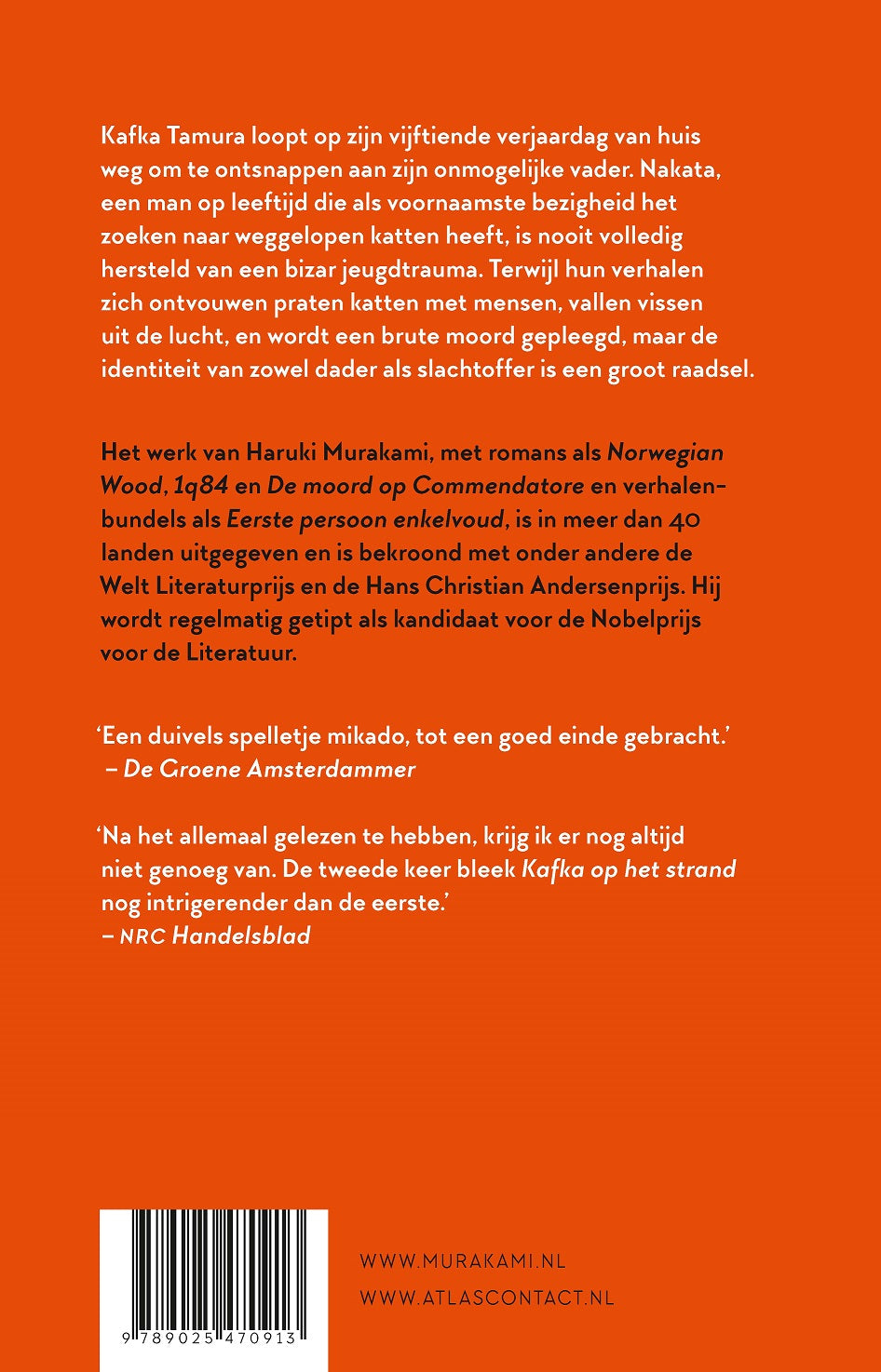 Kafka Tamura loopt op zijn vijftiende verjaardag weg van huis om te ontsnappen aan zijn onmogelijke vader. Satoru Nakata is een gehandicapte man op leeftijd, die als voornaamste bezigheid het zoeken naar weggelopen katten heeft en nooit volledig hersteld is van een bizar jeugdtrauma. Terwijl hun verhalen zich ontvouwen praten katten met mensen, vallen vissen uit de lucht, en wordt een brute moord gepleegd, maar de identiteit van zowel dader als slachtoffer is een groot raadsel.