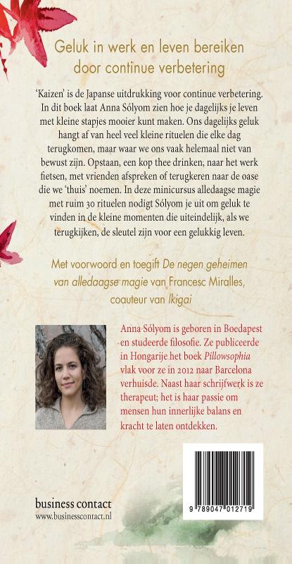 Kaizen is de Japanse uitdrukking voor continue verbetering, in deze minicursus alledaagse magie met ruim 30 rituelen nodigt Sólyom je uit om geluk te vinden in de kleine momenten die uiteindelijk, als we terugkijken, de sleutel zijn voor een gelukkig leven.