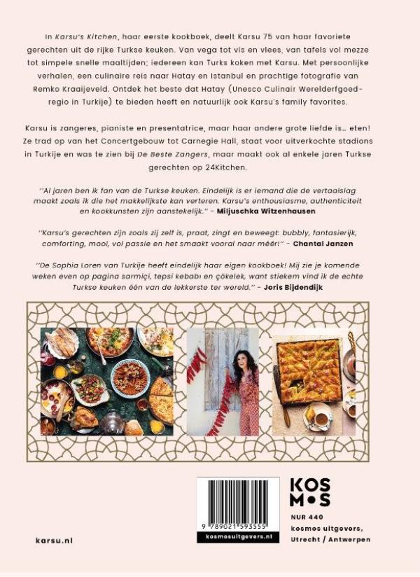 In Karsu’s Kitchen, haar eerste kookboek, deelt Karsu meer dan 75 van haar favoriete gerechten uit de rijke Turkse keuken. Van vega tot vis en vlees, van tafels vol mezze tot simpele snelle maaltijden: iedereen kan Turks koken met Karsu.