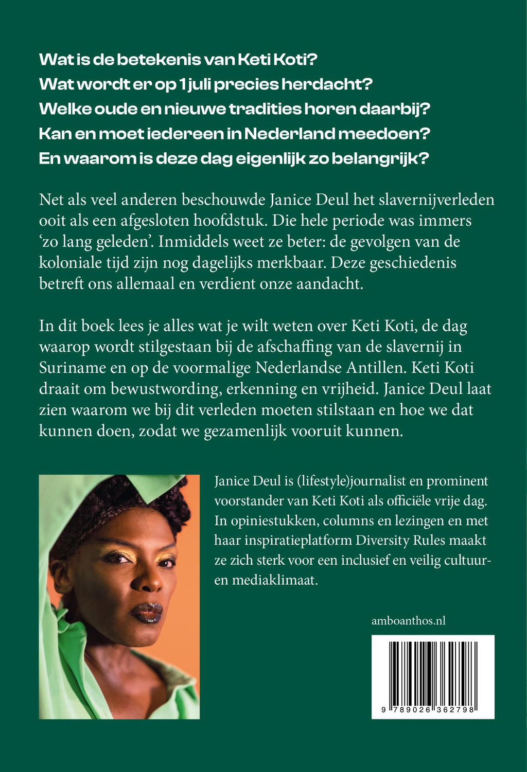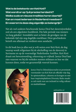 Janice Deul vertelt in Keti Koti: Waarom we de afschaffing van de slavernij moeten herdenken en vieren de geschiedenis en de oude en hedendaagse tradities van Keti Koti. Bovendien betoogt ze hoe Keti Koti er anno nu uit zou moeten zien, zodat we in Nederland gezamenlijk voorwaarts kunnen. Keti Koti is een geïllustreerde gids voor iedereen.Te gebuiken als inleiding, naslagwerk, gids en slijpsteen, met als doel het collectief vergroten van de kennis over Keti Koti, algehele bewustwording en historisch besef rondom thema's als ongelijkheid en vrijheid.