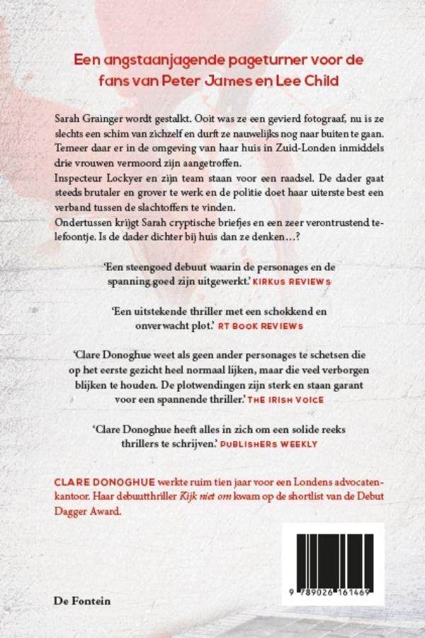 'Kijk niet om' van Clare Donoghue is een thriller voor de fans van Peter James en Lee Child. Fotografe Sarah wordt gestalkt. Wanneer er in haar omgeving in Londen diverse vrouwen vermoord worden aangetroffen, staat de politie voor een raadsel. De dader gaat steeds grover te werk. Wat is het verband tussen de slachtoffers? Ondertussen krijgt Sarah cryptische briefjes en verontrustende telefoontjes. Donoghue heeft alles in zich om een solide thrillerreeks te schrijven.' David Hewson gaf een mooie quote: 'Overtuigend en verontrustend. Een auteur om in de gaten te houden.' Stalking, Londen, angstaanjagende spanning, schokkende twists; de ingrediënten van 'Kijk niet om' van Donoghue.