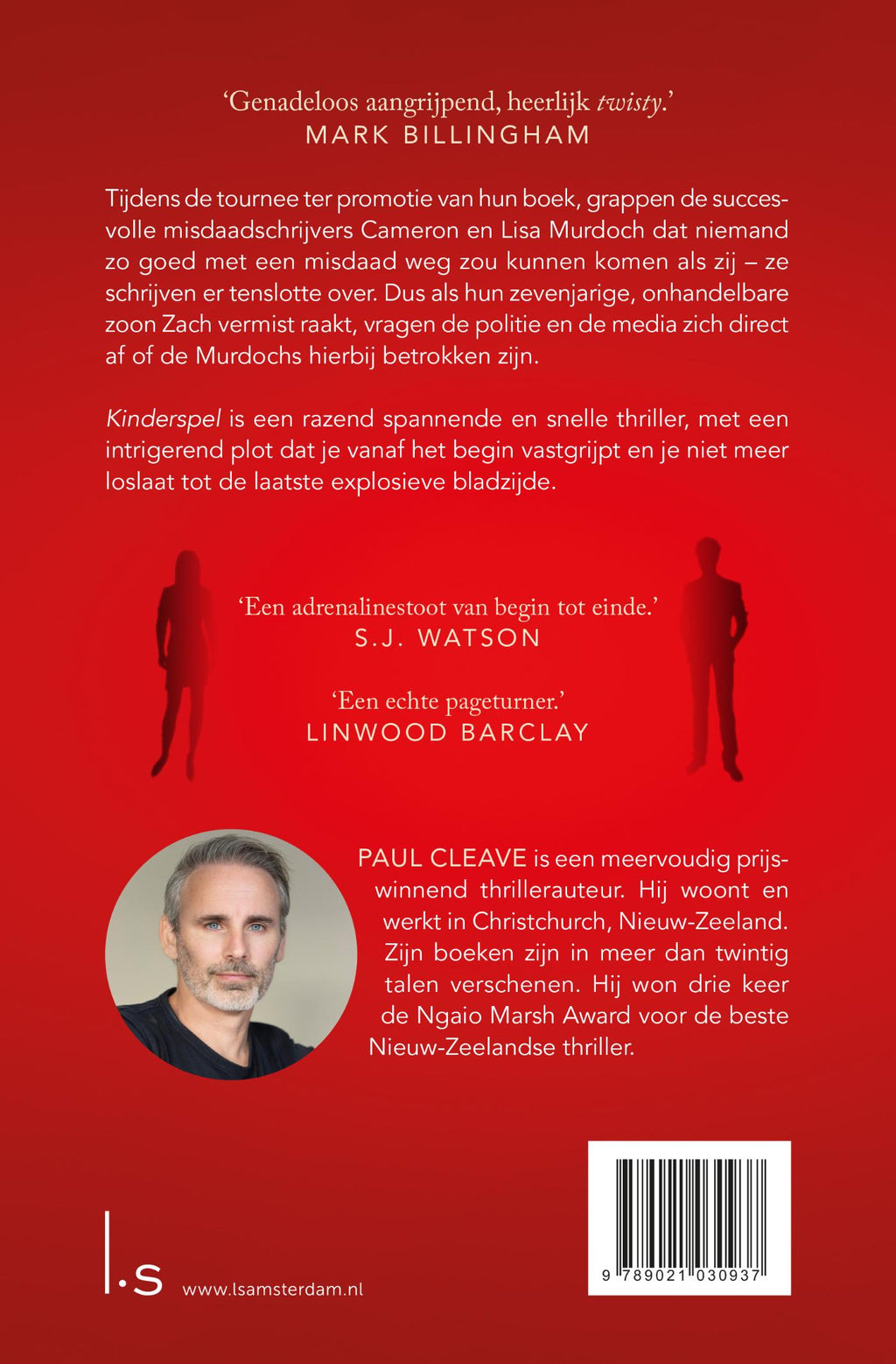 In Kinderspel van internationaal bestsellerauteur Paul Cleave komt een goedbedoelde grap van misdaadschrijverskoppel Cameron en Lisa Murdoch hun duur te staan. Hun zoon verdwijnt en de Murdochs staan bovenaan de verdachtenlijst.