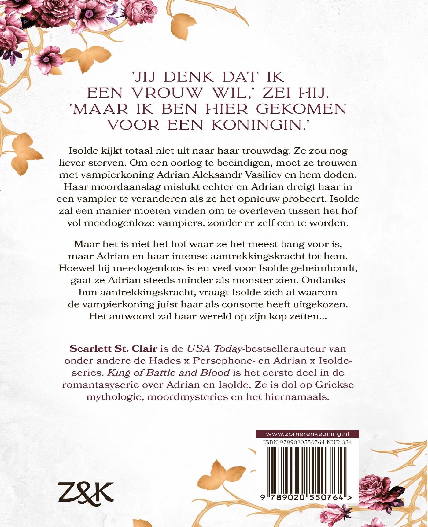 Isolde kijkt totaal niet uit naar haar trouwdag. Ze zou nog liever sterven. Om een oorlog te beëindigen, moet ze trouwen met vampierkoning Adrian Aleksandr Vasiliev en hem doden. Haar moordaanslag mislukt echter en Adrian dreigt haar in een vampier te veranderen als ze het opnieuw probeert. Isolde zal een manier moeten vinden om te overleven tussen de meedogenloze vampiers, zonder er zelf een te worden. En van iedereen aan het hof is Adrian het gevaarlijkst. Zijn aantrekkingskracht zou haar dood kunnen betekenen… 'King of Battle and Blood' is het eerste deel in de Adrian x Isolde-serie van Scarlett St. Clair. Eerder schreef ze al de inmens populaire vierdelige Hades x Persephone-serie.