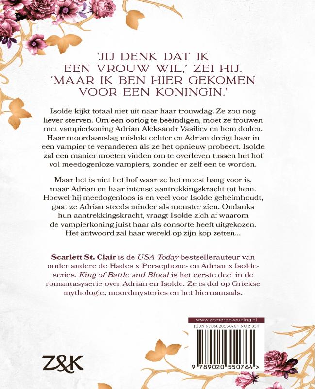 Isolde kijkt totaal niet uit naar haar trouwdag. Ze zou nog liever sterven. Om een oorlog te beëindigen, moet ze trouwen met vampierkoning Adrian Aleksandr Vasiliev en hem doden. Haar moordaanslag mislukt echter en Adrian dreigt haar in een vampier te veranderen als ze het opnieuw probeert. Isolde zal een manier moeten vinden om te overleven tussen de meedogenloze vampiers, zonder er zelf een te worden. En van iedereen aan het hof is Adrian het gevaarlijkst. Zijn aantrekkingskracht zou haar dood kunnen betekenen… 'King of Battle and Blood' is het eerste deel in de Adrian x Isolde-serie van Scarlett St. Clair. Eerder schreef ze al de inmens populaire vierdelige Hades x Persephone-serie.