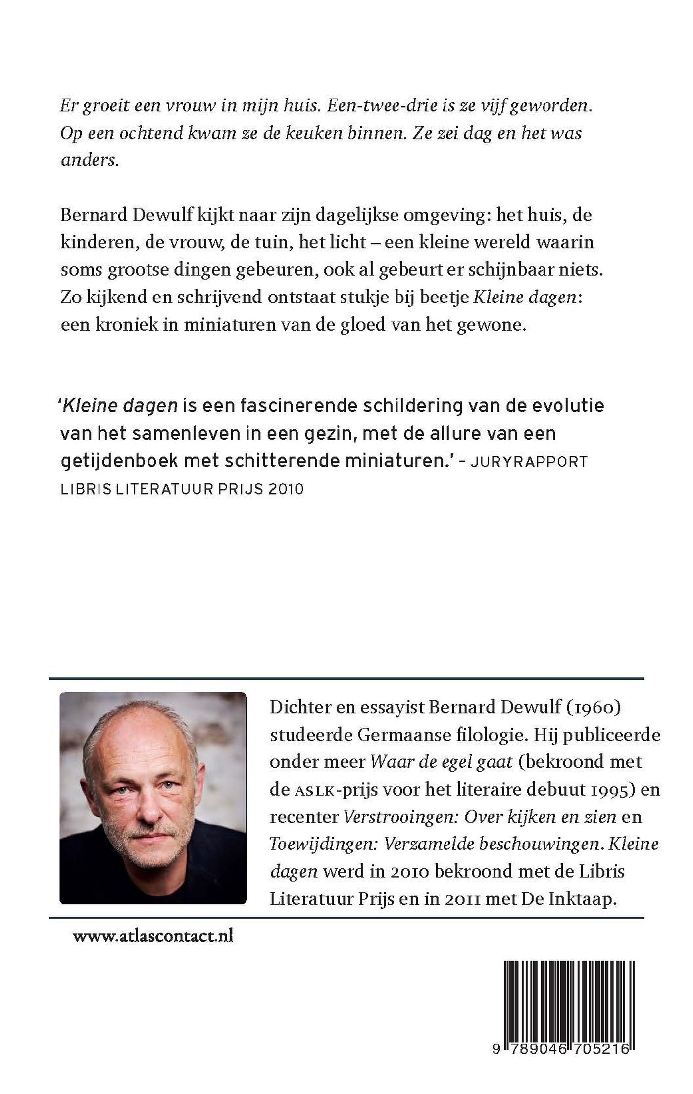 Bernard Dewulf (1960) kijkt naar zijn dagelijkse omgeving: het huis, de kinderen, de vrouw, de tuin, het licht een kleine wereld waarin soms grootse dingen gebeuren, ook al gebeurt er schijnbaar niets. Zo kijkend en schrijvend ontstaat stukje bij beetje Kleine dagen: een kroniek in miniaturen van de gloed van het gewone.