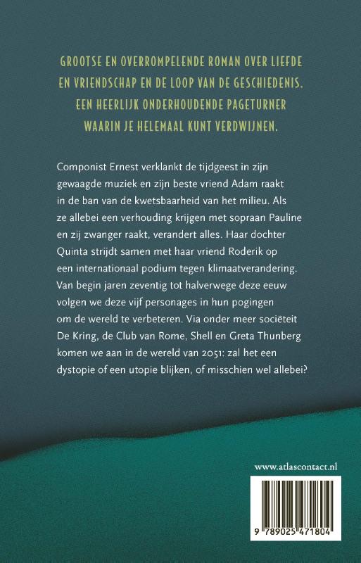In ‘Klimaatcantate’ van Eppo Leon verklankt componist Ernest de tijdgeest in zijn gewaagde muziek en zijn beste vriend Adam raakt in de ban van de kwetsbaarheid van het milieu. Als ze allebei een verhouding krijgen met sopraan Pauline en zij zwanger raakt, verandert alles. Haar dochter Quinta strijdt samen met haar vriend Roderik op een internationaal podium tegen klimaatverandering. Van begin jaren zeventig tot halverwege deze eeuw volgen we deze vijf personages in hun pogingen om de wereld te verbeteren.