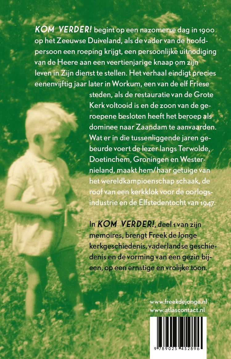 ‘Kom verder!’ van Freek de Jonge begint op een nazomerse dag in 1900 op het Zeeuwse Duiveland, als de vader van de hoofdpersoon een roeping krijgt, een persoonlijke uitnodiging van de Heere aan een veertienjarige knaap om zijn leven in Zijn dienst te stellen. Het verhaal eindigt precies eenenvijftig jaar later in Workum, een van de elf Friese steden, als de restauratie van de Grote Kerk voltooid is en de zoon van de geroepene besloten heeft het beroep als dominee naar Zaandam te aanvaarden. Wat er in die tussenliggende jaren gebeurde voert de lezer langs Terwolde, Doetinchem, Groningen en Westernieland, maakt hem/haar getuige van het wereldkampioenschap schaak, de roof van een kerkklok voor de oorlogsindustrie en de Elfstedentocht van 1947. Kom verder! vormt deel 1 van zijn memoires.